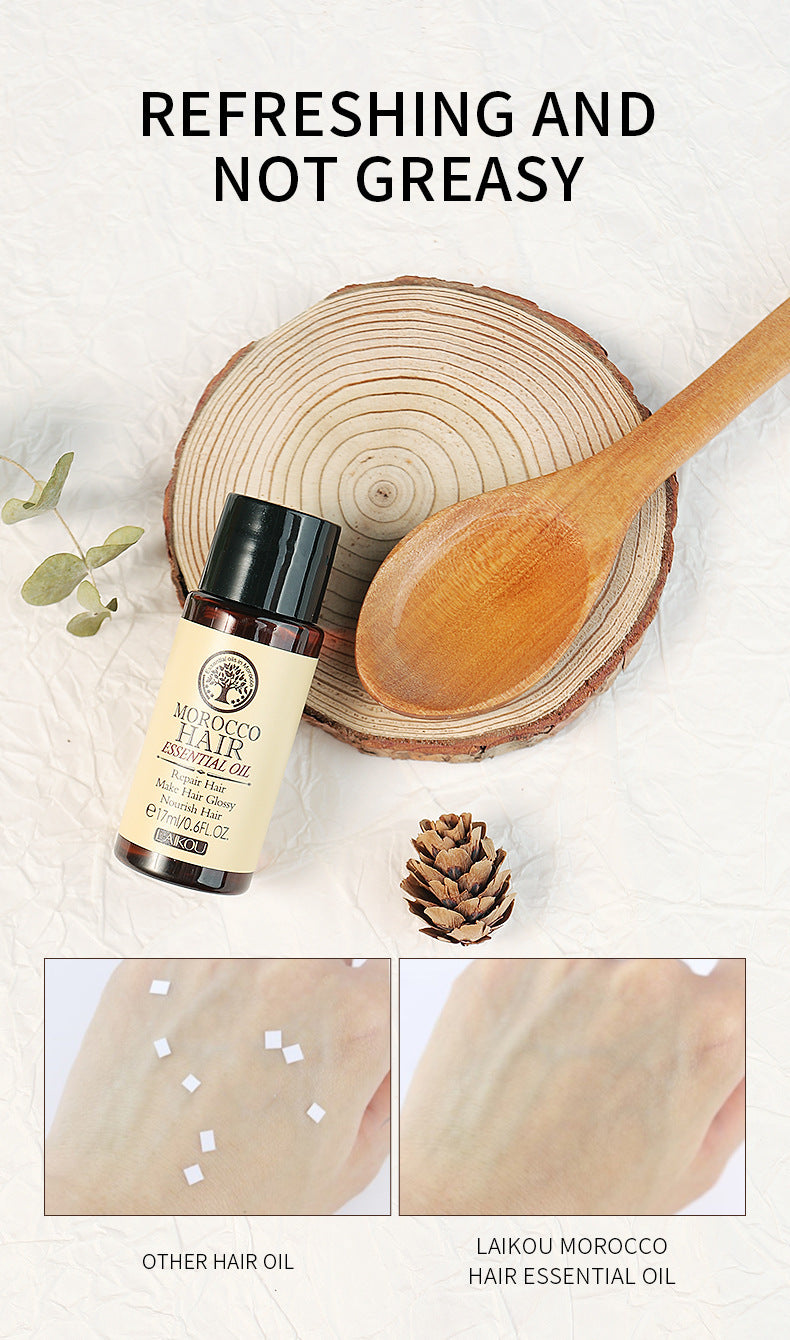 Effects: LAIKOU Morocco Hair Essential Oil is rich in Morocco "liquid gold" Argan oil, which can repair the damaged hair, smooth the dry hair and create a protective film to protect hair from the damage of sunlight and other harmful substances. It can effectively repair hair scales and provide nutritions to make hair smooth and silky.