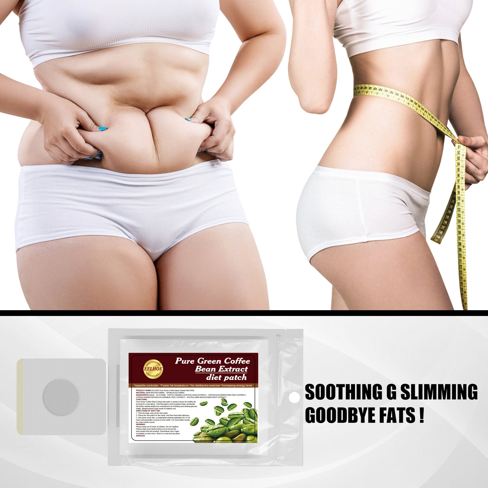 Our belly button patches (30pcs) contain glycerin, Coffea arabica (coffee) seed extract. It addresses fat and swelling issues, improves your metabolism, and easily loses weight with a purely organic, tried-and-true remedy. Its use is simple: first tear open the bag, pick up the small piece, then pass the small piece on the navel, then fix it with adhesive, then one piece a day, continuous external application for 12-24 hours, generally a one-month course of treatment. For better results, try a two-month course. And it can pre-engineer and promote the body's natural body shaping mechanisms.