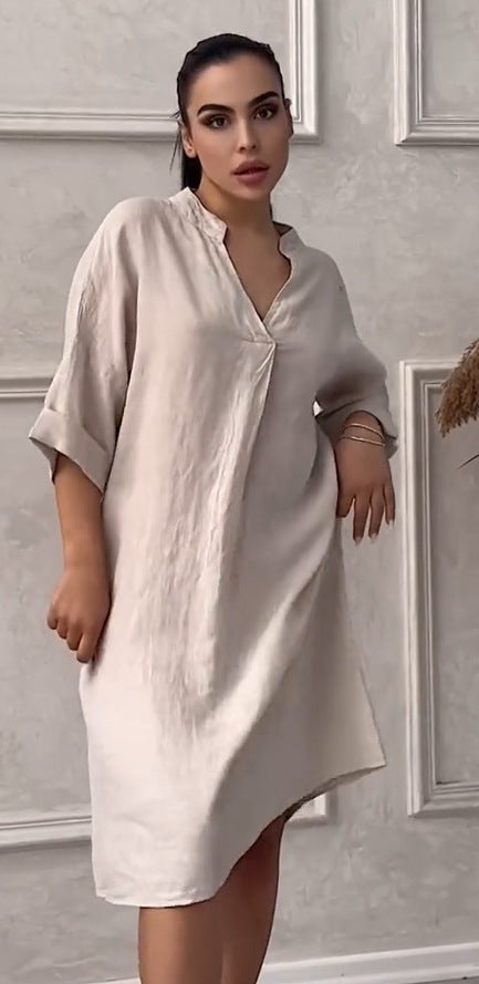Fashion Cotton Linen Women V-neck Loose Plus Size Dress