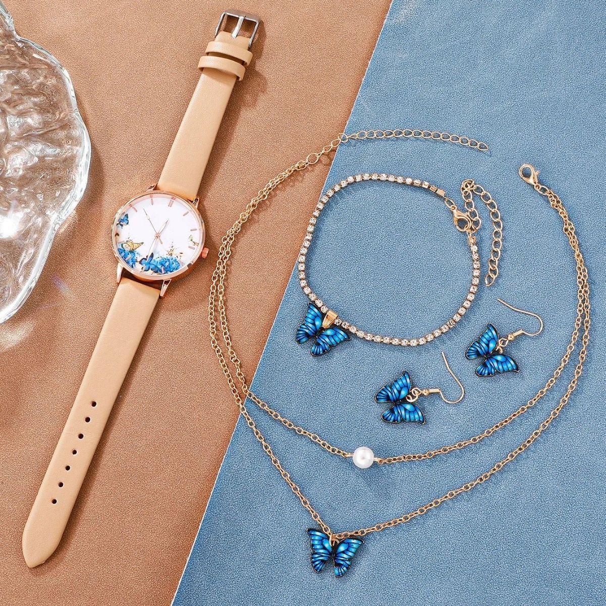 J5pcsset All-match Fashion Butterfly Women's Belt Watch Suit