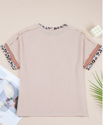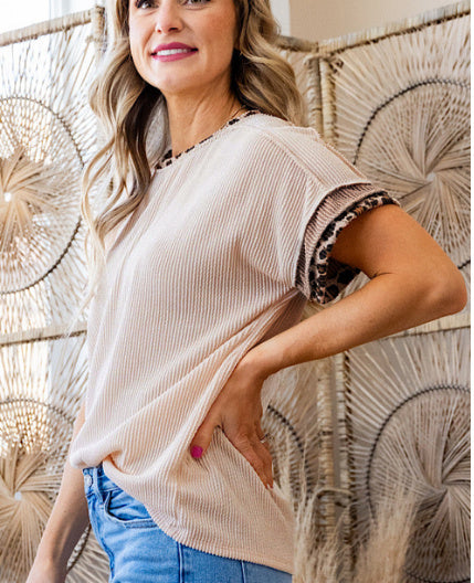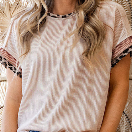 Jet Stream Leopard Patchwork Corded Knit Crew Neck T Shirt