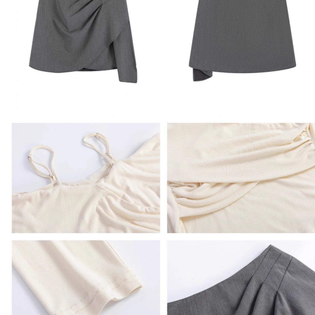 Main colors: Cream Yellow T-shirt, Black T-shirt, Grey Half Skirt