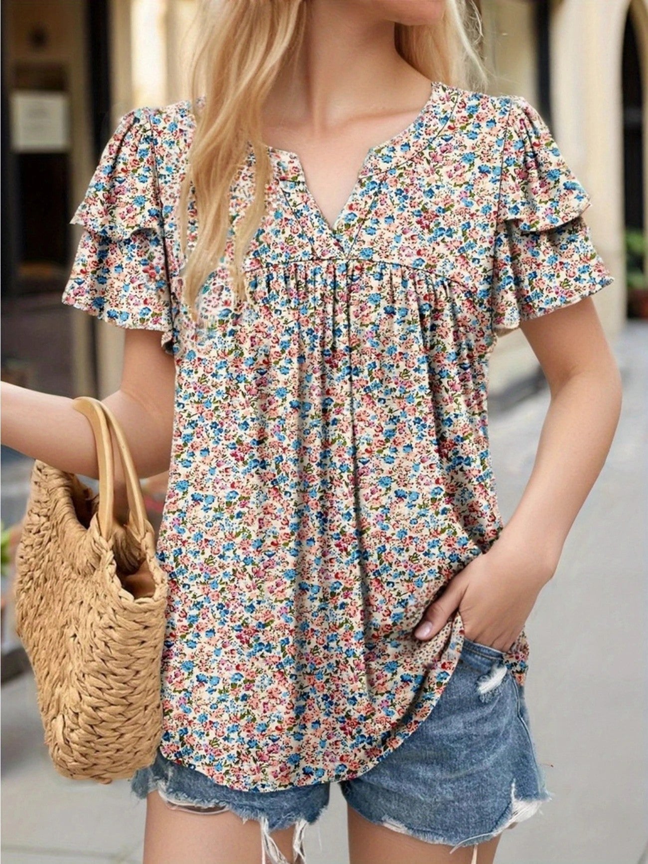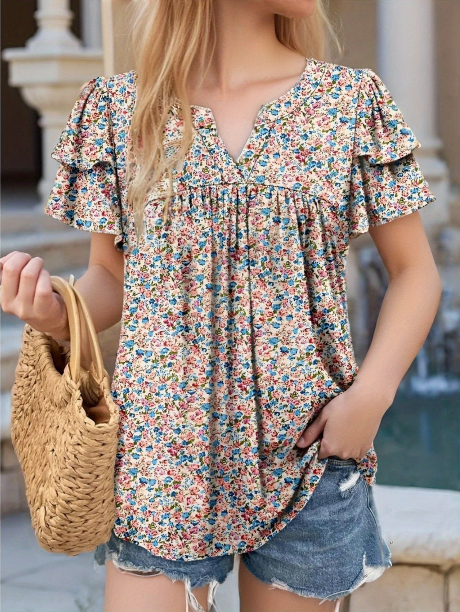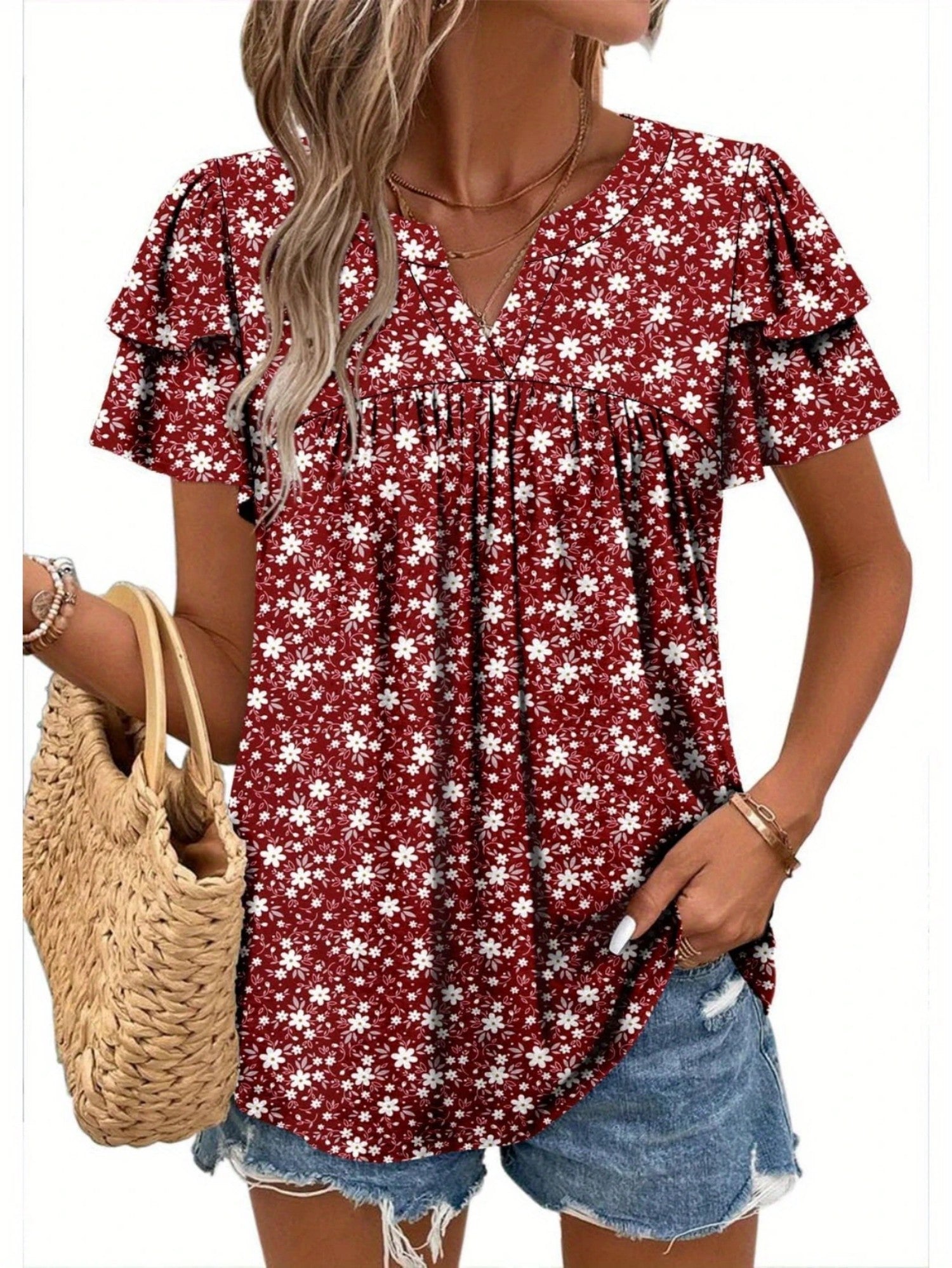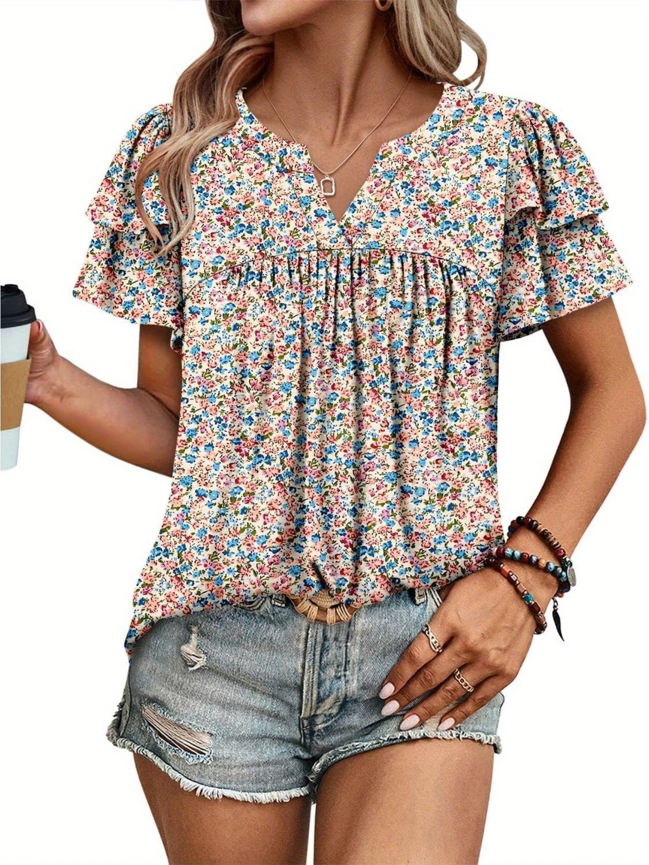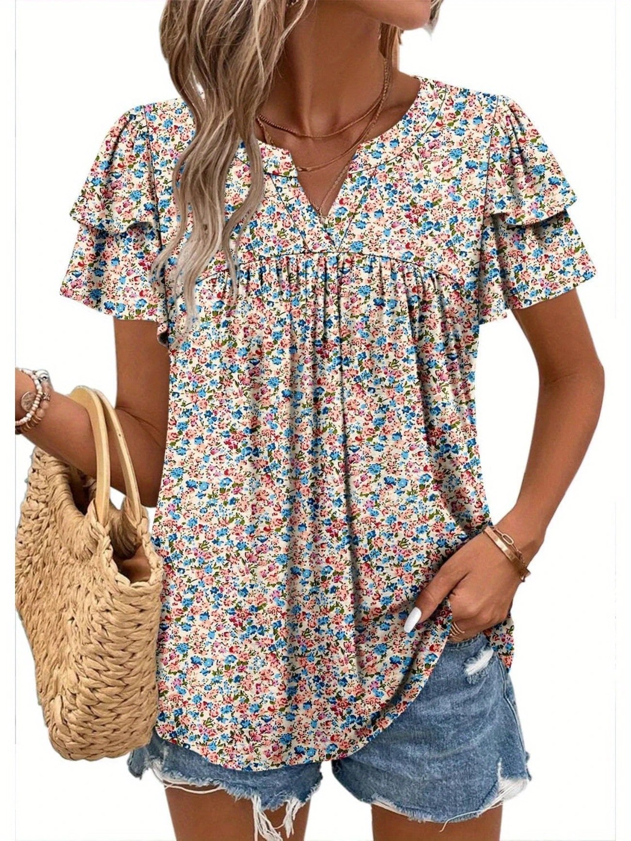 Nylixa Floral Print Summer Top – Women’s Casual V-Neck Short Sleeve Ruffle Blouse