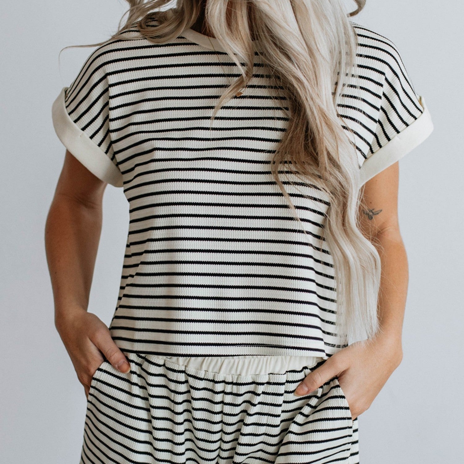 Effortlessly stylish and ultra-comfy, this Women’s Striped Knit Co-ord Set is your go-to outfit for relaxed days and casual outings. Featuring a soft ribbed knit fabric with classic black and white stripes, this co-ord set includes a short-sleeved, round-neck top and elasticated high-waisted shorts for ultimate ease and movement. Whether you're lounging at home, running errands, or meeting friends, this set keeps your look put-together and breathable all day long.