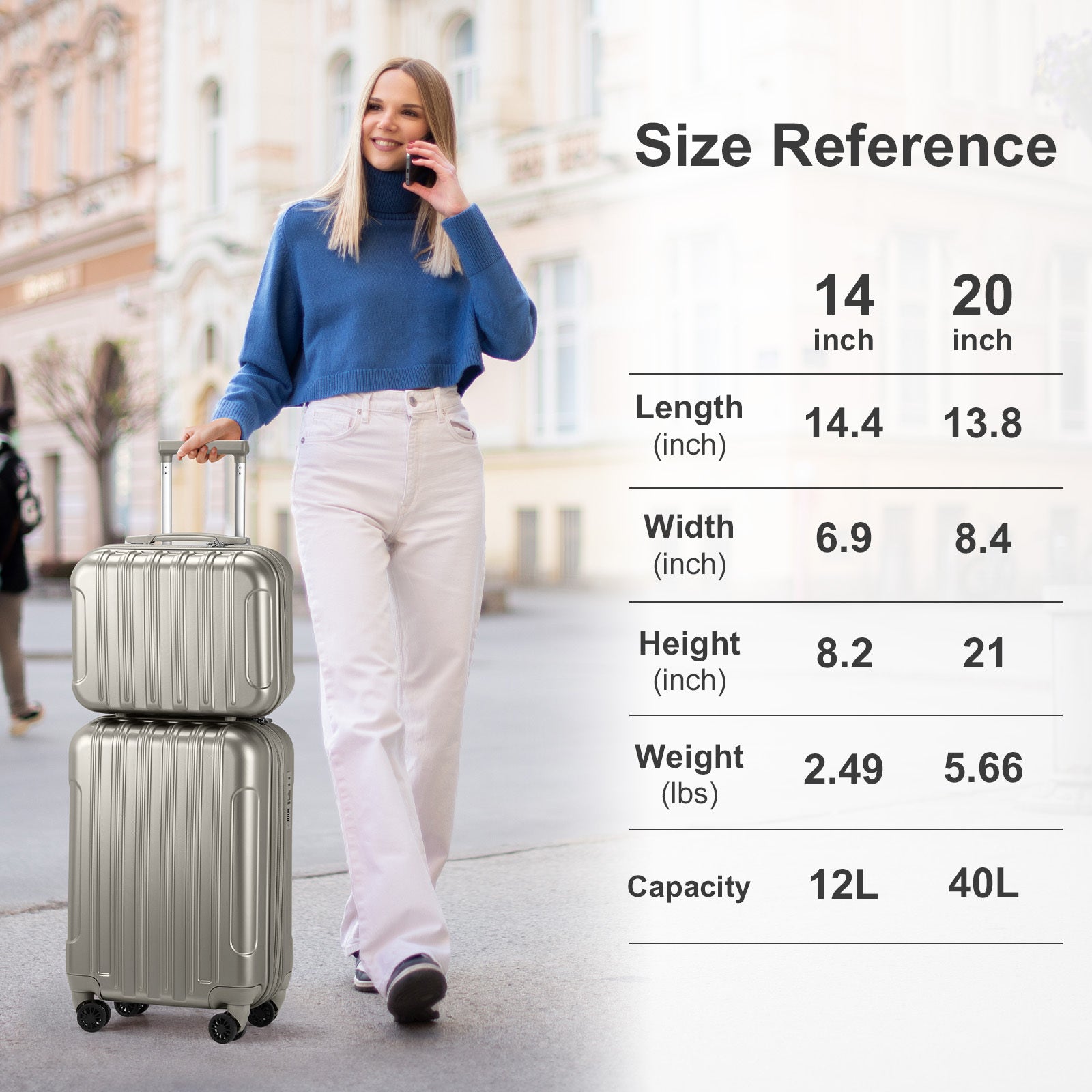 7.Package includes: 1 x 20" carry-on luggage (15.7" x 7.6" x 22.2", 6.17 lbs) and 1 x 14" (13" x 11.4" x 6.7", 2.2 lbs) cosmetic travel case. 20" suitcase fits Carry-on size requirements for most US and international airlines.