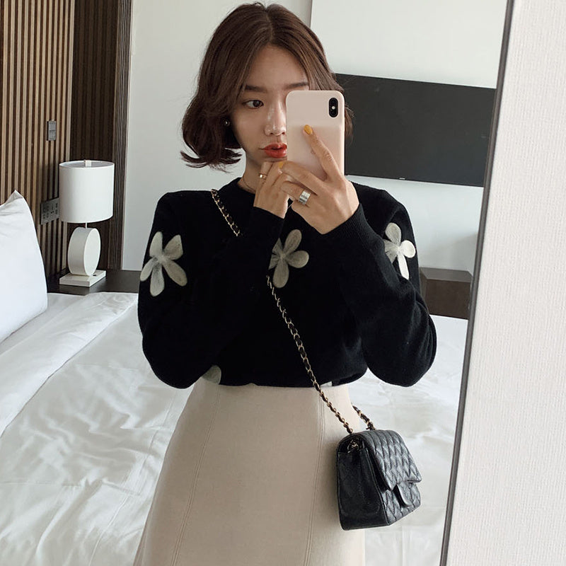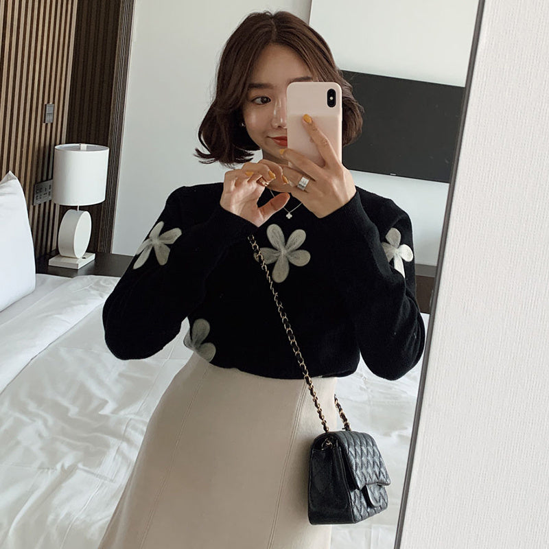 Women's Vintage Embroidery Flower Round Neck Pullover Long Sleeve Knitting Sweater